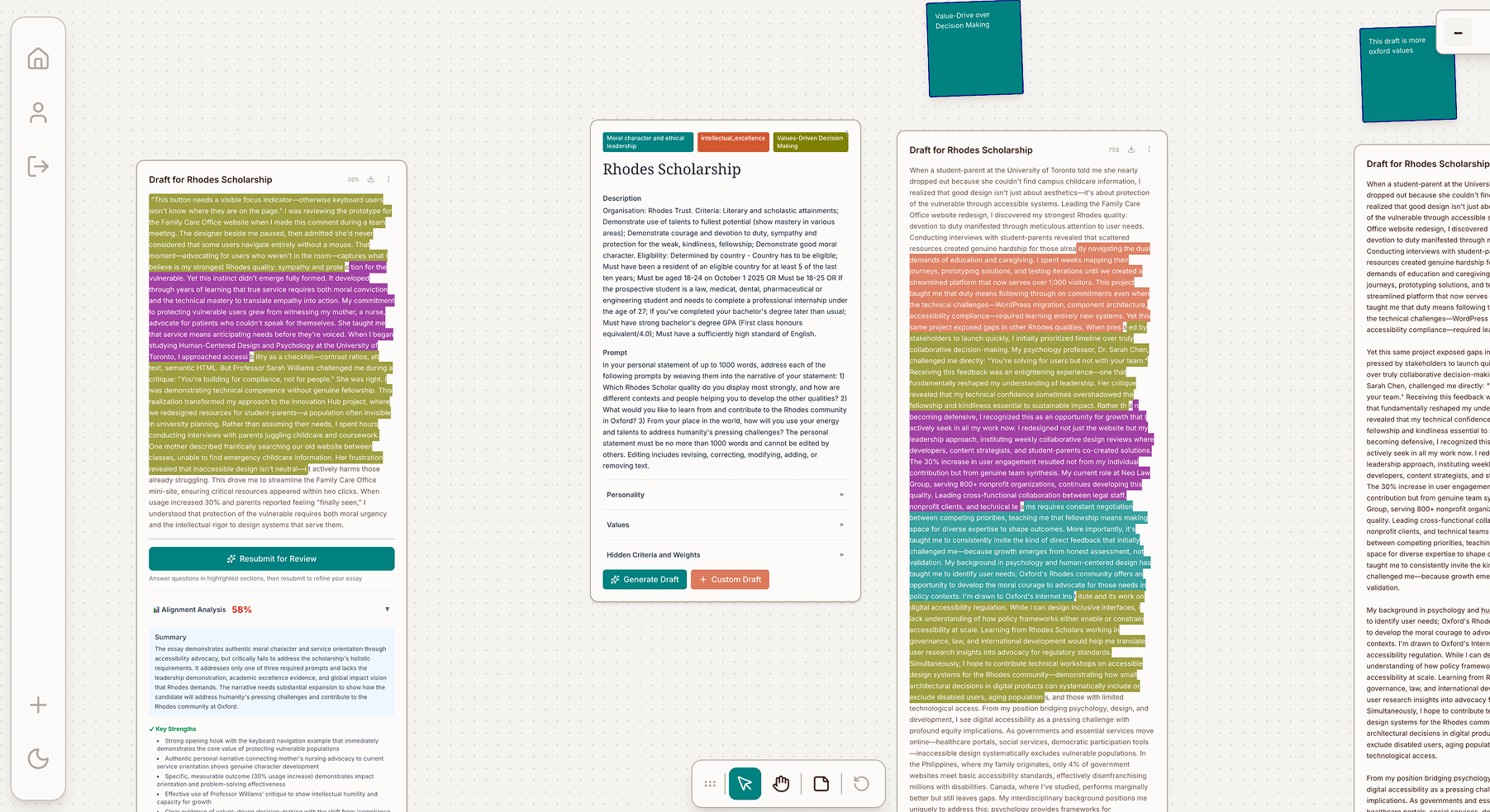 The result is a vector canvas-based platform powered by the claude API for multiple drafts organized visually, insight from scholarship winning drafts, and AI interaction that feels more like a conversation.